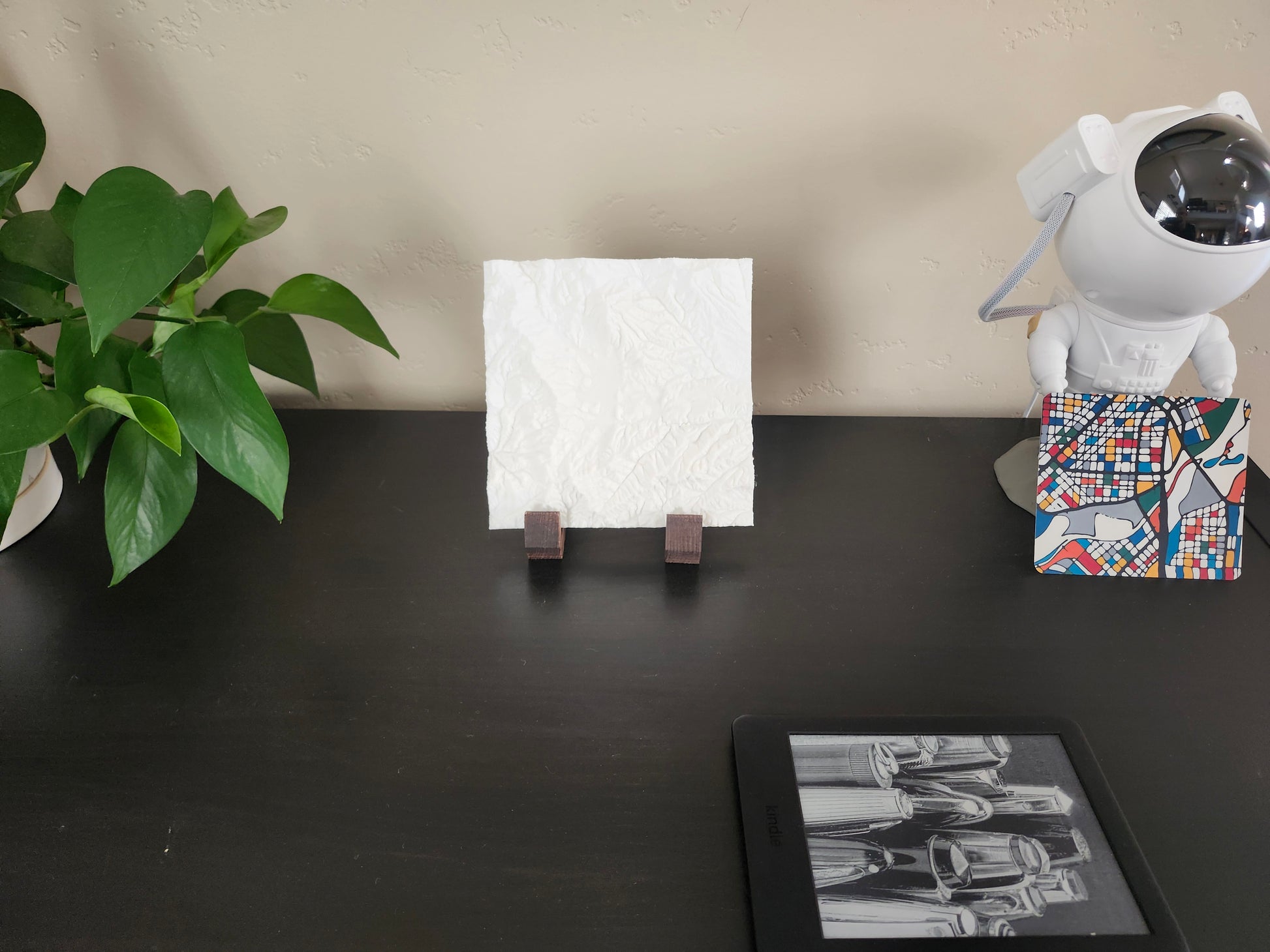 The print comes with an optional wood or plastic stand to place the print on any surface.